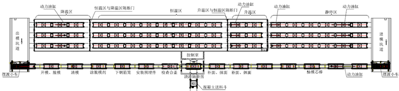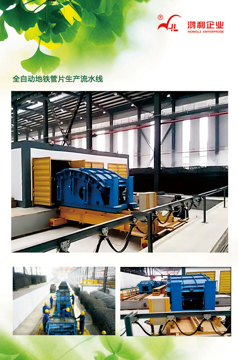 自行研發(fā)了本項目,該項目運用PLC控制技術(shù)、現(xiàn)場總線技術(shù)、傳感器技術(shù)等先進自控技術(shù),實現(xiàn)了盾構(gòu)管片生產(chǎn)自動化的要求。同時,項目采用了:行走裝置采用液壓單向傳動方式,以保證流水線上的模具車運行平穩(wěn);液壓單向傳動頂端裝有一個單向推力臺車,通過液壓缸推動模具臺車向前運行;振動房內(nèi)設(shè)置了自主研發(fā)的氣囊隔振平臺或多輪式架空平臺,使振動時避免能量傳到地面造成能量的損失,又減少對模具輪軸承的損傷。同時又最大限度的保證了管片的成型精度;末端管片搬運單元設(shè)置了機械式自夾緊出模水平吊具,安全可靠。結(jié)合自主研發(fā)的機械式管片翻轉(zhuǎn)平臺(采用渦輪蝸桿減速機和齒輪齒條傳動機構(gòu))比傳統(tǒng)的翻轉(zhuǎn)平臺更加的高效可靠,使管片成豎直狀態(tài),再利用自主設(shè)計的側(cè)向吊具把管片平穩(wěn)吊至自主研發(fā)的軌道平板車,該平板車采用變頻技術(shù)與鋼絲繩牽引所結(jié)合,有行走平穩(wěn),使用壽命長等特點。場外還設(shè)置了一整套檢測設(shè)備如抗?jié)B試驗臺、抗彎抗拔試驗臺,三環(huán)拼裝臺等全套設(shè)備。